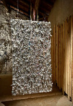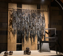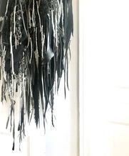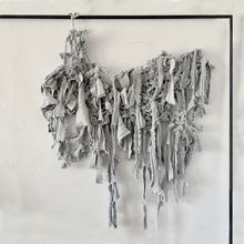 Sur un châssis en métal, tendre des fils et pour plus d'épaisseur, découper du tissu en lanières, du cuir, du plastique...Lorsque ce travail s'est imposé à moi, je n'avais pas encore conscience du lien avec le trait, le dessin. Le Geste textile se situe entre la sculpture (volume, matière) et le dessin (le trait, la ligne.)